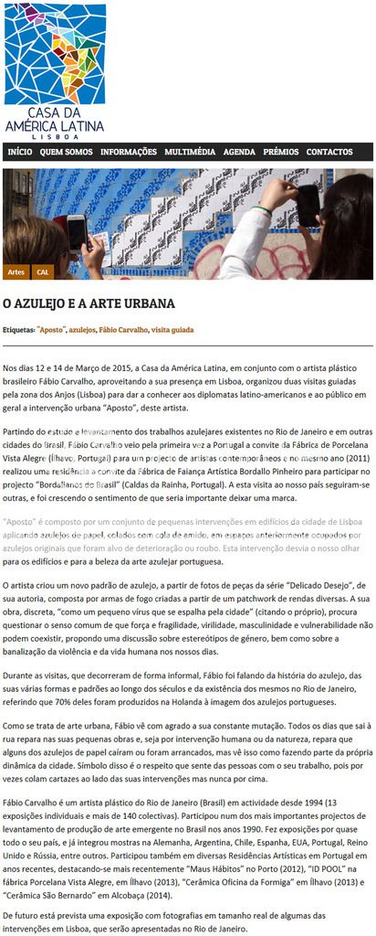 Fábio Carvalho é também um apaixonado pelos azulejos antigos, tendo até um projecto paralelo de levantamento dos azulejos antigos na sua cidade, o Rio de Janeiro. O mesmo pode ser acompanhado através do blog: azulejosantigosrj.blogspot.com.br. Ao mesmo tempo, desde que começou a vir a Lisboa com regularidade, ficou interessado pelos “remendos” errados feitos com padrões de azulejos diferentes dos originais para colmatar faltas. Estes novos padrões criados foram um dos pontos de partida para este novo projecto de intervenção artística chamado de “Aposto”. O artista criou um novo padrão de azulejo, a partir de fotos das suas peças da série “Delicado Desejo”. Esta série é composta por armas de fogo criadas a partir de um patchwork de diversas rendas.