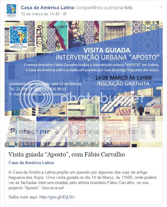 A exposição Rejunte, de Fábio Carvalho, com a curadoria de Marco Antonio Teobaldo, será inaugurada no dia 27 de maio, às 18 horas, na Galeria Pretos Novos. Obras inéditas e registros da ação artística em Lisboa, realizados a partir da intervenção urbana Aposto, no qual o artista criou três novos padrões de azulejos impressos a laser sobre papel, que foram aplicados com cola de amido em fachadas de prédios lisboetas onde os azulejos originais haviam desaparecido por deterioração ou vandalismo. Foram 35 dias e 300 peças aplicadas em 45 pontos de intervenção. Os "azulejos de papel", ao mesmo tempo que causam um certo estranhamento ao olhar, podem ser por vezes facilmente confundidos com os azulejos originais. Os projetos de arte urbana de Fábio Carvalho atuam como pequenas inserções, que invadem o espaço e ganham uma força maior ao tensionarem o que já estava lá.